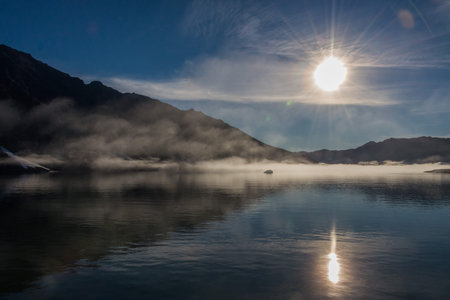 Mountain lake in the morning mist. Russia, Siberia, Altai mountains.