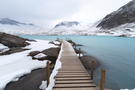 freezing fiord with boardwalk and wooden steps leading down to glacial lagoon, created with generative ai