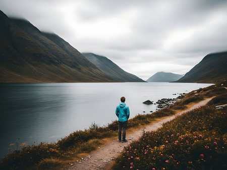One person looking at trekking map, dramatic sky at dusk, lake and snowy mountains, nordic cold feeling