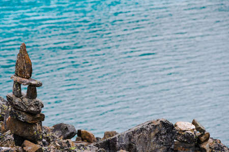 Neat pile of stones for tourists on shore of turquoise lake. Stone mound on shore of sea