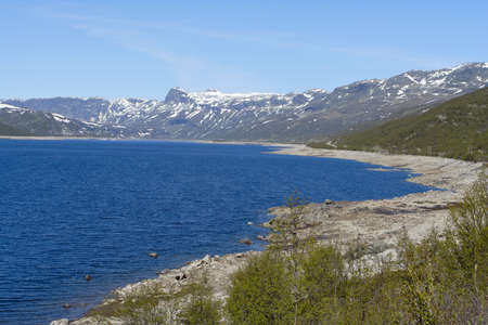 Picturesque landscape mountains of Norway. Beautiful view of the lake. Rocky shore of mountain lake.