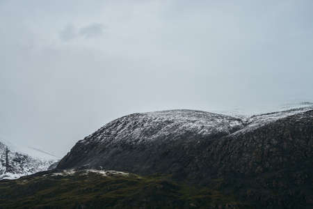 Minimalist highlands landscape with snow-capped mountains under cloudy sky. Snowbound high mountain range in overcast weather. Atmospheric minimalism with green mountains, white snow and gray sky.