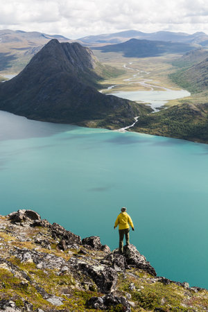Back view of tourist standing on top of a rock and enjoying fascinating view with mountains and lakes around. Concept of adventure in Scandinavian countries.