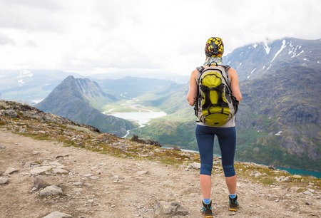 Girl standing on Besseggen ridge overlooking Gjende and Ovre Leirungen lakes, Norway
