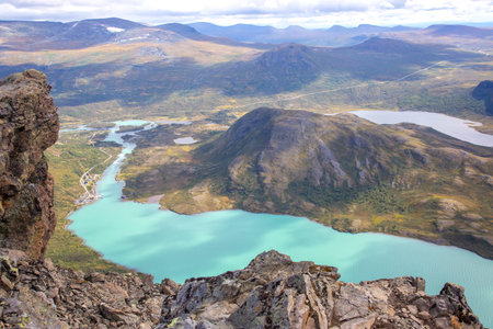 Vibrant turquoise lakes nestled among steep mountains create a breathtaking landscape in Norway. This serene view showcases the natural beauty of the region, with lush greenery and rocky terrains.