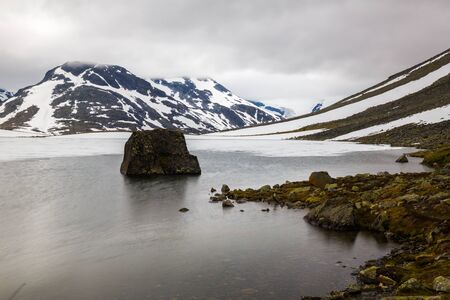 Tourism holidays and travel. Melting snow in mountains, Norway Scandinavia.