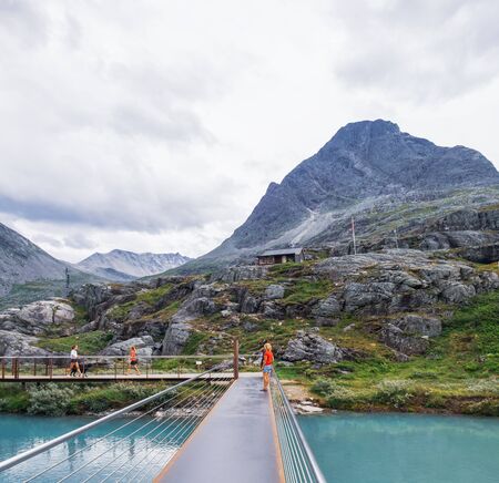 Trollstigen, Norway - July 31, 2018: Tourists walk, take photos and enjoy the views of Trollstigen in Norway.