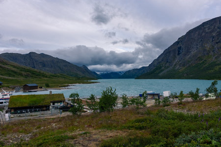 buildings on coast of majestic Gjende lake, Besseggen ridge, Jotunheimen National Park, Norway
