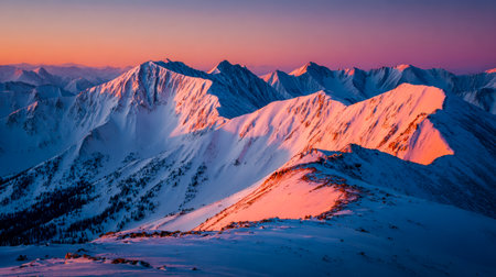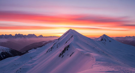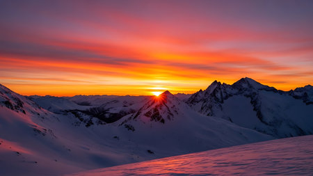 A stunning sunrise casts golden hues across a snowy mountain range. The tranquil winter scene showcases vast, untouched snowfields and peaks under a clear sky.
