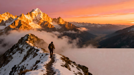 A solitary figure stands on a snowy ridge, back to the camera, gazing at the vibrant sunrise illuminating the majestic, rugged peaks stretching across the horizon