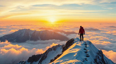 A man is standing on a snow-covered mountain peak, looking out at the beautiful sunrise. The sky is filled with clouds, and the sun is just beginning to rise, casting a warm glow over the landscape