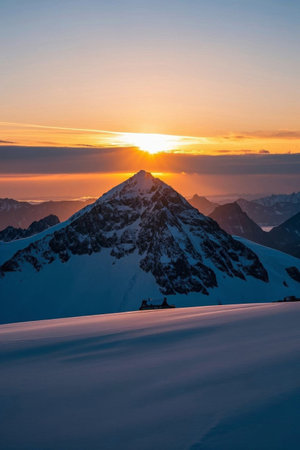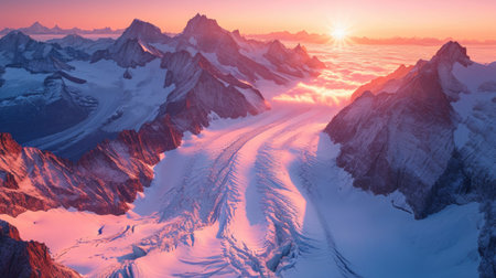An idyllic sunrise in the Swiss Alps, featuring a beautiful aerial view of a snowy glacier