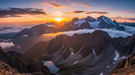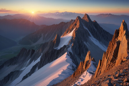 A majestic mountain range bathed in the warm glow of sunrise or sunset, highlighting snow-capped peaks and dramatic shadows.