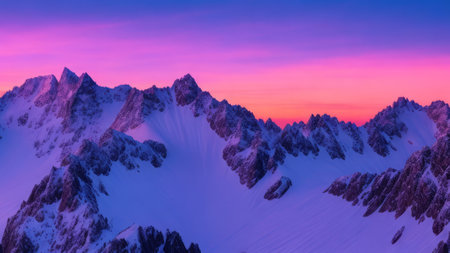 A majestic, snow-laden mountain skyline bathed in vibrant sunset hues, casting intense shadows under a sky of swirling, vivid colors.