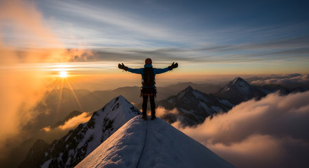 A mountain climber stands on a snowy summit with arms outstretched at sunrise. The person wears a helmet and backpack, and is roped in. The background shows a vast mountain range above the clouds, lit by the rising sun, conveying success and adventure.