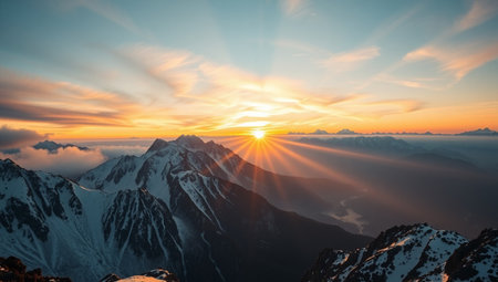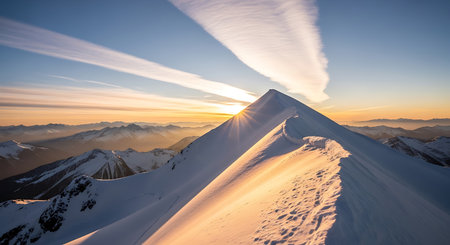 A breathtaking view of a snow-covered mountain peak at sunrise, with the sun peeking over the ridge, casting a warm glow on the snow and illuminating the stars in the sky.
