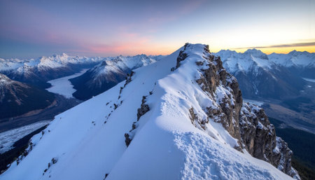 A breathtaking snow-covered mountain summit bathed in the soft, warm hues of sunrise. The tranquil scene evokes peace and the raw beauty of nature's grandeur, with delicate pink and orange gradients painting the sky above the pristine white slopes.