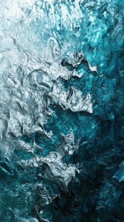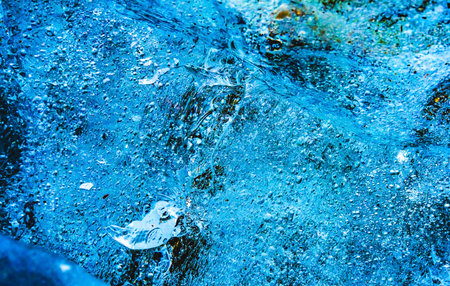 Textures of ice create a mesmerizing pattern, reflecting various shades of blue hues. The interplay of light gives life to the frozen surface, forming intricate details.