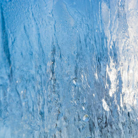 Beautiful blue ice background on glass in bright sunlight.