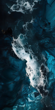 An aerial view capturing the dramatic interplay of dark sea waves and white foam, evoking the raw power and mystery of the ocean.