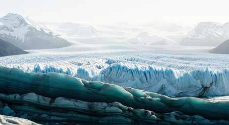 Vast glacial landscape with intricate blue and turquoise ice formations, surrounded by snow capped mountains under a bright, hazy sky. Shows the immense scale of a glacier.