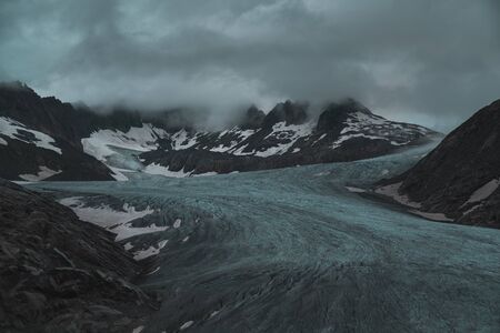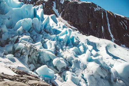 Beautiful scenery on the mountains and the glacier Svartisen landscape in Norway scandinavian nature landmarks ecology concept. Blue snow and ice.