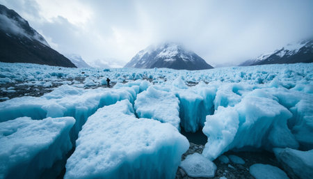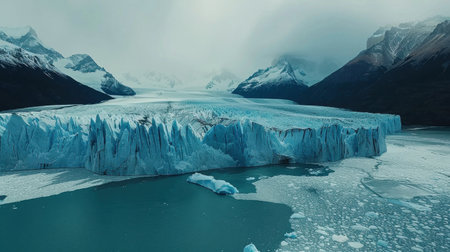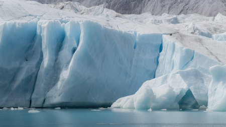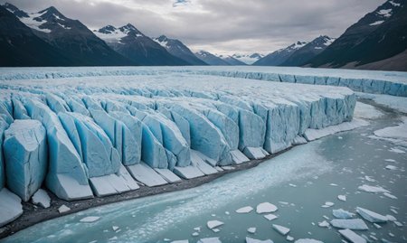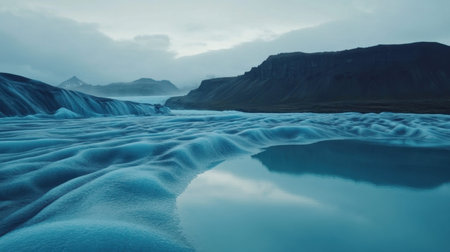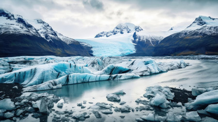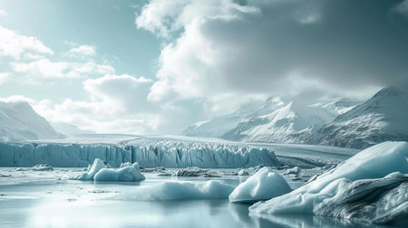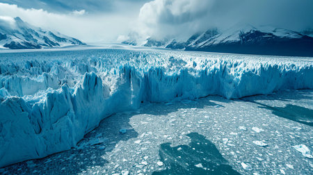 Captivating glacial landscape featuring stunning blue ice textures and tranquil water reflecting the dramatic clouds and mountains. Perfect for nature enthusiasts.