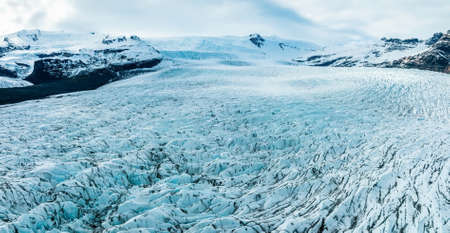 Vatnajokull National Park, one of three national parks in Iceland, the area include Vatnajokull glacier, Skaftafell and Jokulsargljufur.Beautiful aerial photo of ice water and glacier. Panoramic shot.