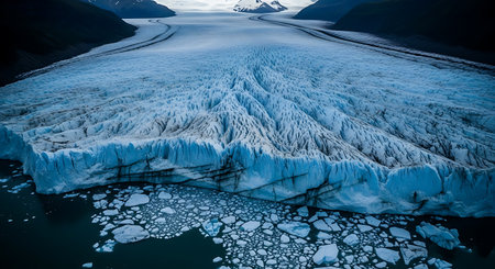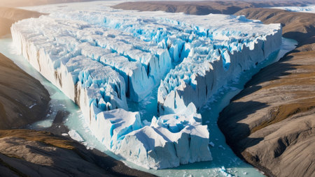 AI Generated. Aerial view of a massive glacier with blue ice and rocky surroundings