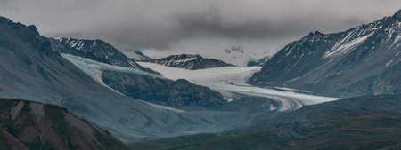 Picturesque Mountains of Alaska in summer. Snow covered massifs, glaciers and rocky peaks. Beautiful natural background.