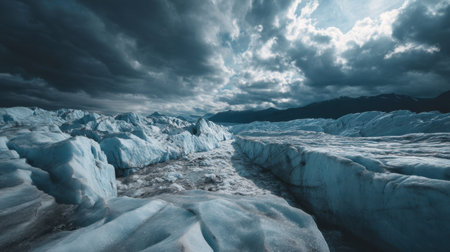 A breathtaking view of a glacial landscape features icy formations under a dramatic cloudy sky, showcasing nature's raw beauty and tranquility.