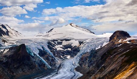 Panoramic view at Pasterze Glacier Grossglockner among Austrian Alps mountains summits blue sky clouds.