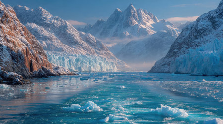 Serene arctic landscape with icebergs and misty mountains, tranquil view. Nature and climate concept