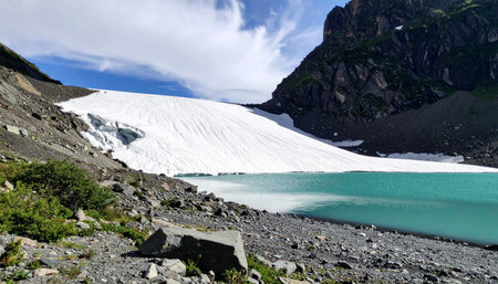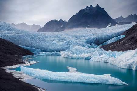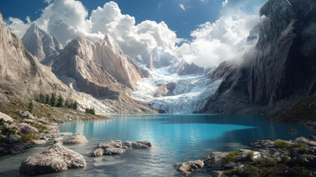 AI Generated. The majestic presence of a glacier looms over a remote lake its icy waters boasting miraculous healing properties