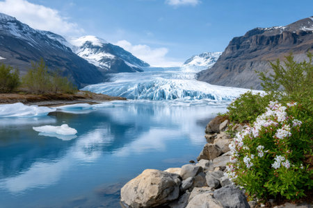 Glacier melting into a calm lake with snow-capped mountains and green plants under a blue sky