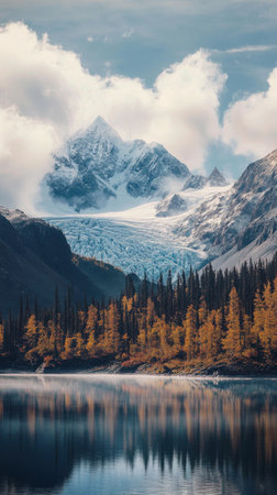 Majestic mountains surround a tranquil lake, capturing the beauty of Wrangell-St Elias. Autumn colors contrast with glacial peaks under a blue sky, creating a serene atmosphere.