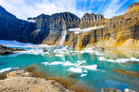 A stunning panoramic view of Upper Grinnell Lake with floating icebergs and the majestic Grinnell Glacier