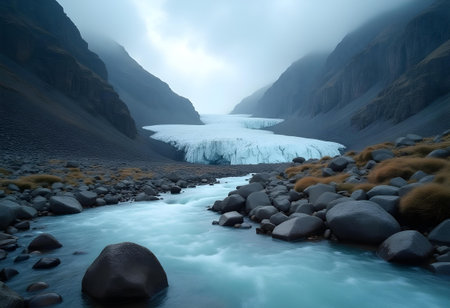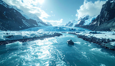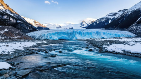 Stunning glacier landscape featuring vibrant blue river flowing through icy terrain, surrounded by majestic mountains under clear sky. scene evokes sense of tranquility and awe