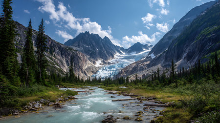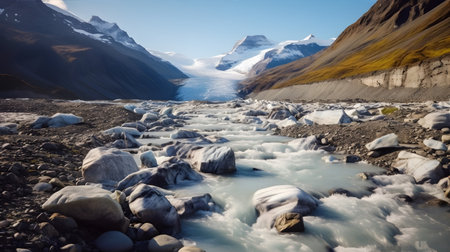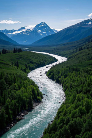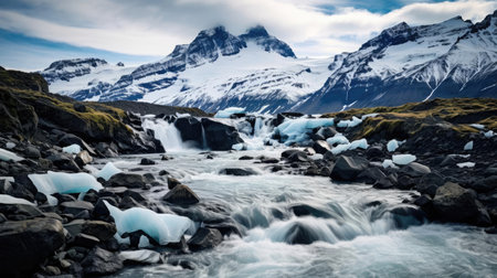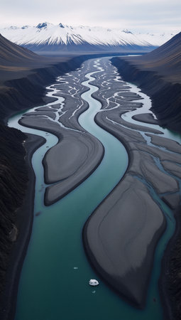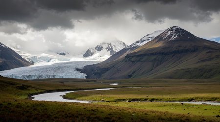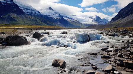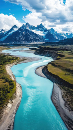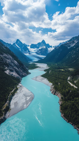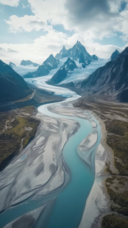A breathtaking river meanders through a stunning glacier-covered mountain range, showing the beauty of nature's untouched landscape. The scene is serene and captivating.