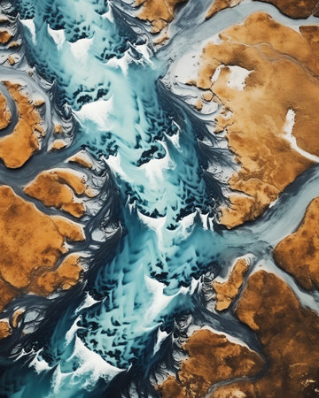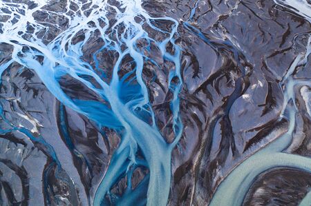 Top view of dramatic abstract icelandic glacier river delta flowing through rugged landscape in Highlands of Iceland