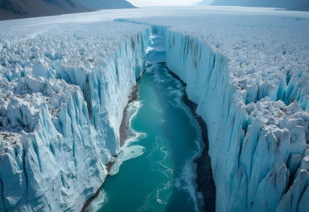 An aerial perspective captures the stunning contrast of a vibrant turquoise river as it carves a winding path through a vast, white glacier.