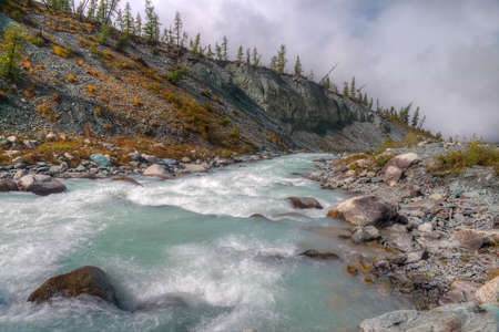 Atmospheric landscape with clear water stream flows into mountain river among moraines in rainy weather. Bleak scenery with milky river among rocks. Clear water stream flows into milk mountain river.