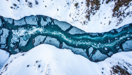 Aerial view of a frozen mountain river in the winter season.