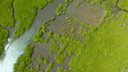 Aerial view of mangrove forest and river on the Siargao island. Mangrove jungles, trees, river. Mangrove landscape. Philippines.
