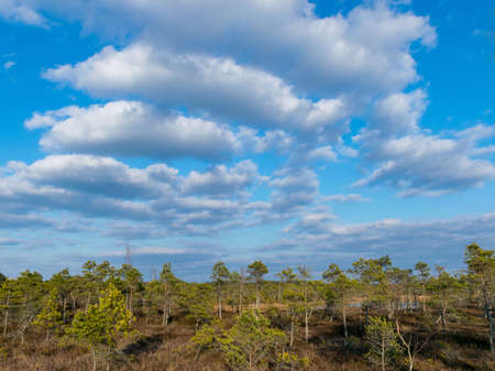 landscape with blue swamp lakes surrounded by small pine and birch trees and green moss on spring day with blue sky in the Great Kemeri Bog, Latvia