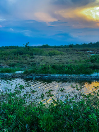 Florida wetlands with water between green wild vegetation. Tropical ecosystem at sunset