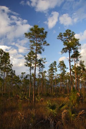 Bright white cumulus clouds forming over sawgrass prairie in Everglades National Park, Florida with hammock containing slash pines in foreground.