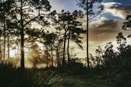 Glass field and Pine tree forest nature trail under afternoon sun at Phu Kradueng National park, Loei - Thailand