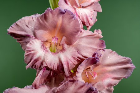 Beautiful Blooming gladiolus chocolate on a green background. Flower head close-up.