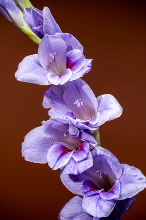 A close-up of a stalk of purple gladiolus blooms with delicate water droplets on the petals, set against a warm, earthy brown background